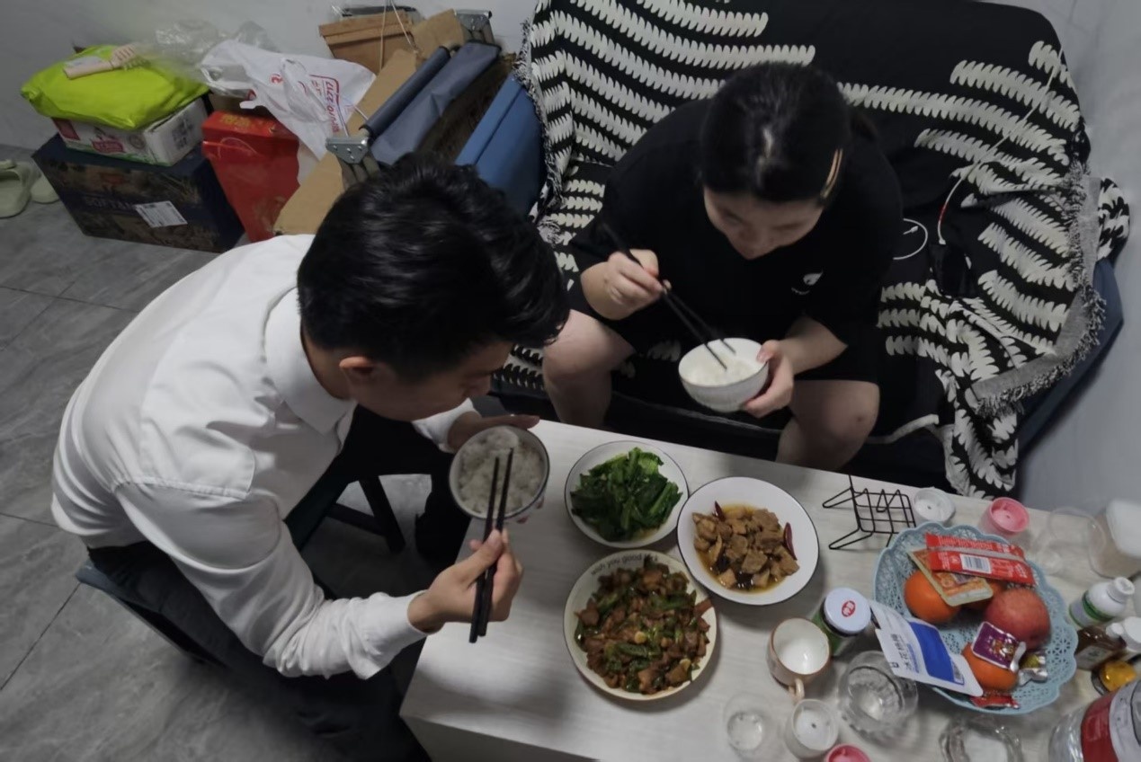 夫妻俩更喜欢自己在家做饭。李佳俊步行十分钟到家,妻子已经焯好牛腩,腌上肉片,切了青椒,只等下锅。他们老家在广东梅州,但外出工作后也喜欢上吃辣。