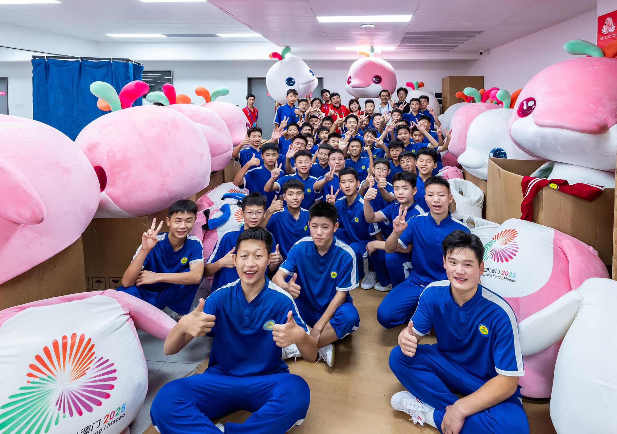 扮演吉祥物的四十位武术少年,来自鹅坡武校河南登封和广东佛山两个校区,年龄在十二到十六岁之间。经历8月初的严苛选拔和在各自校区为期一个多月的基础训练,再到9月中旬起两个校区集中合练,王华辉透露,为了更好地完成舞台呈现,孩子们每天要训练八九个小时,其中戴头套训练的时长都要五六个小时,训练时还要克服负重和高温,反复走台、记点位和参照物。