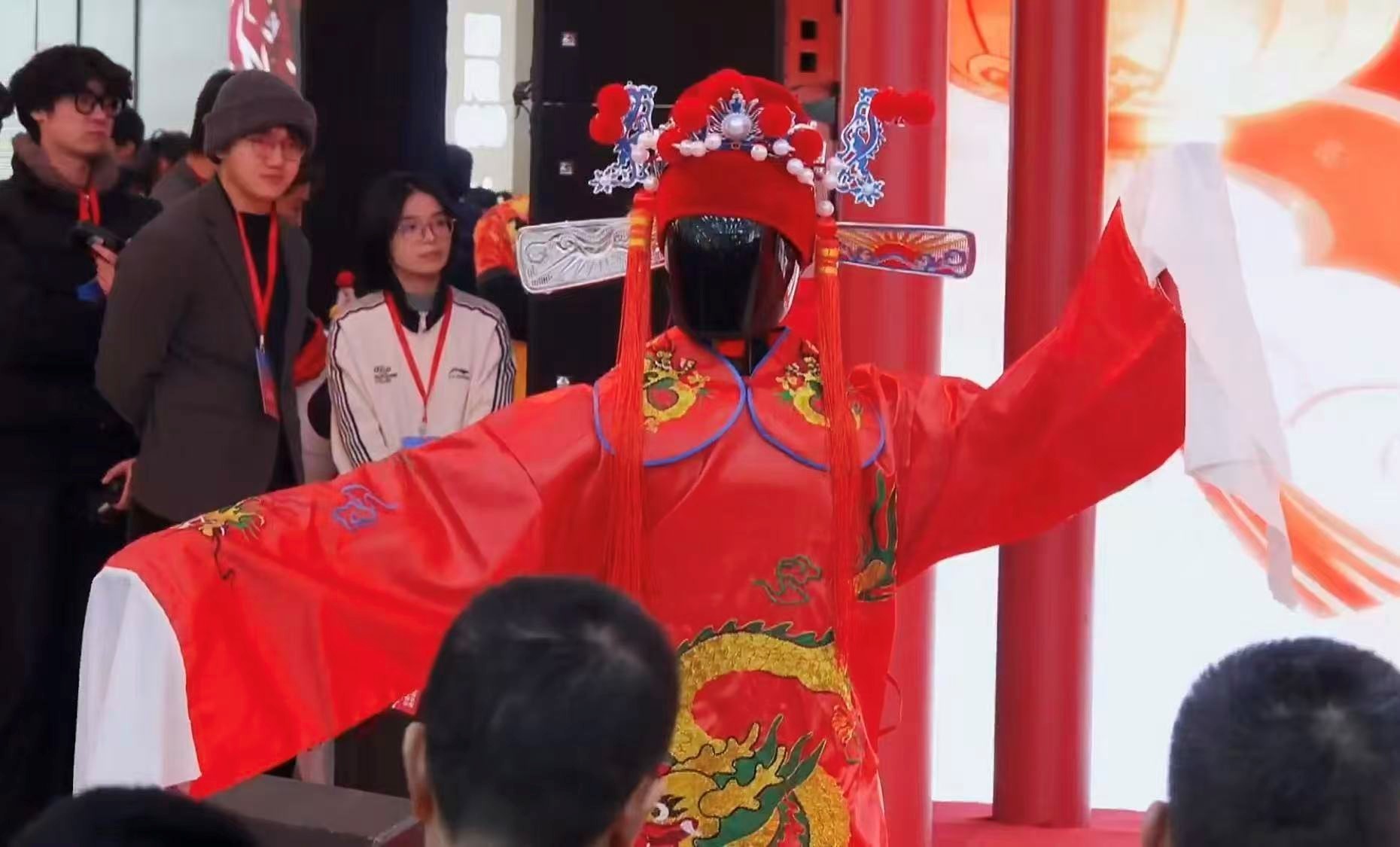 机器人在表演戏曲,郎天(左二)和同事在身后注视(@北京海淀直播截图)