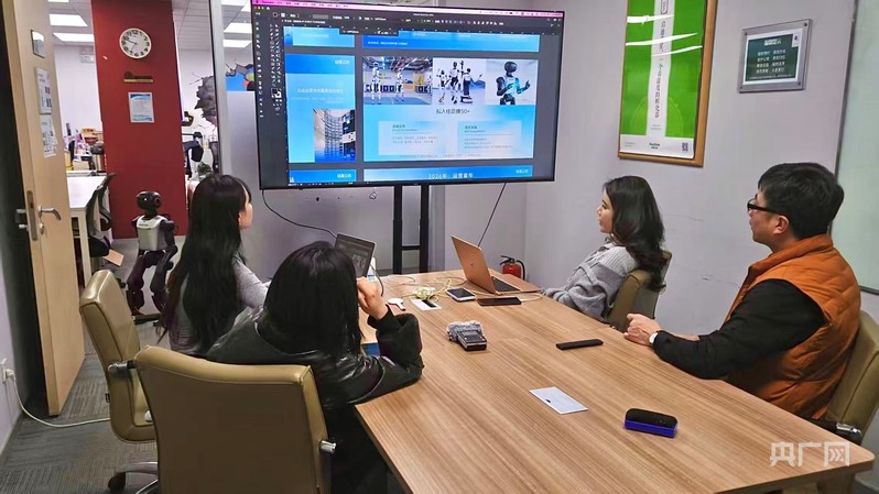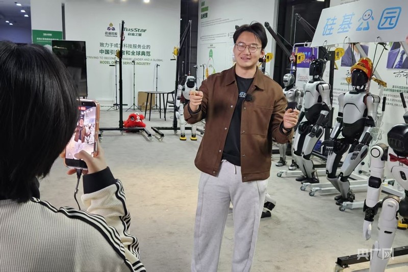 郎天和同事拍摄短视频介绍机器人租赁业务(记者白杰戈 摄)