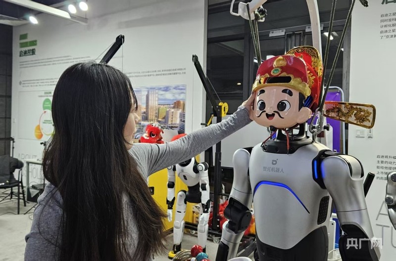 员工为机器人调整“财神爷”面具(记者白杰戈 摄)